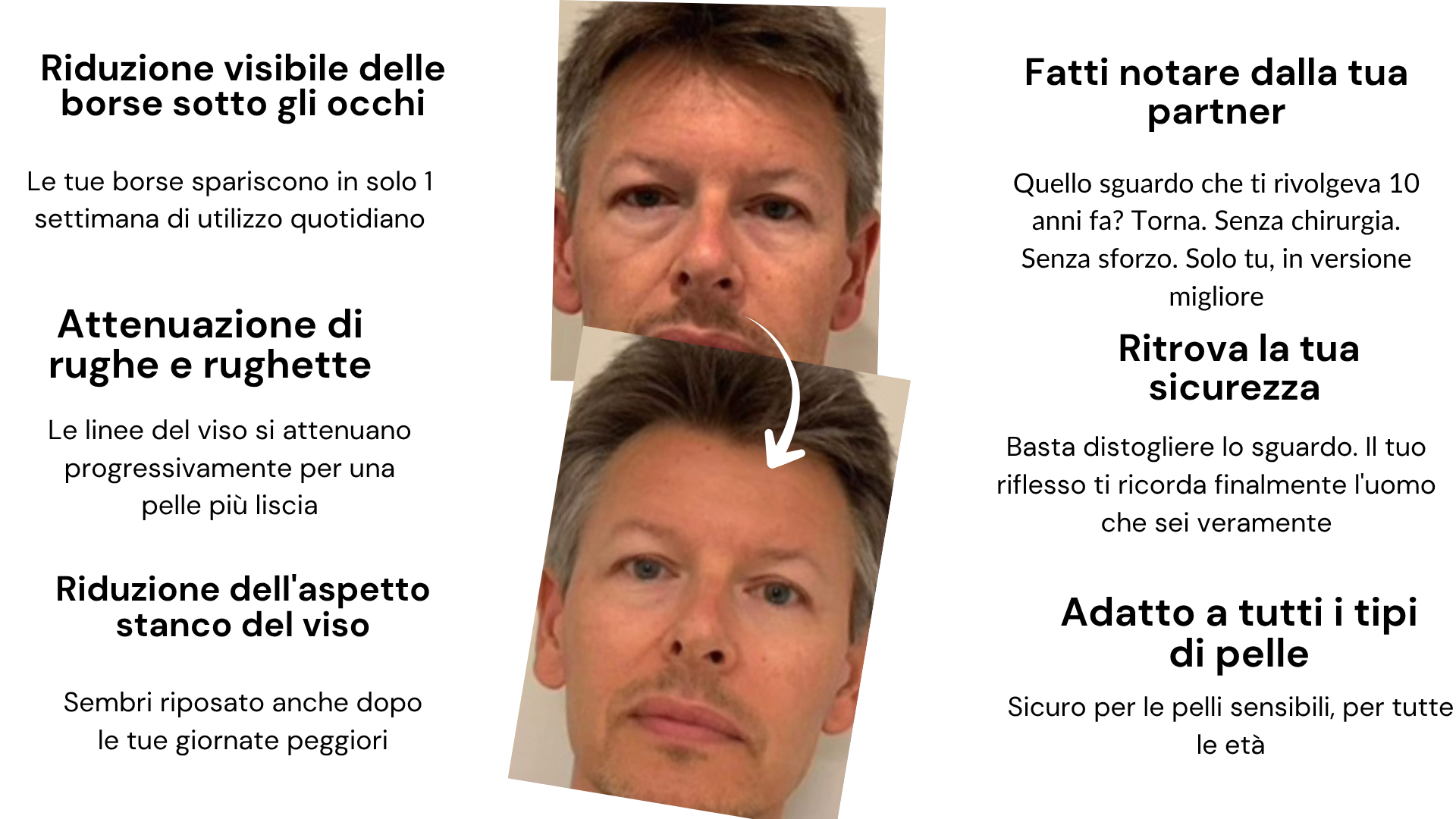 Risultati clinici: riduzione del 67% delle rughe e dell'80% delle borse in 7 giorni. Un prodotto dall'efficacia dimostrata e 100% naturale.